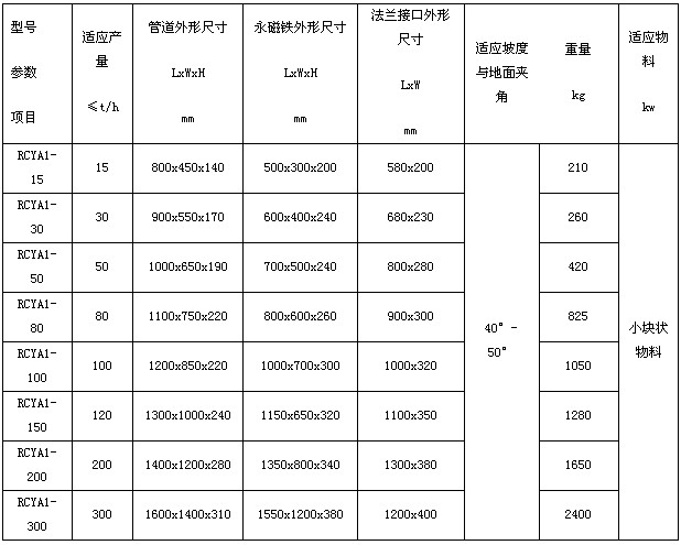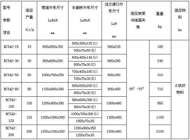 RCYA1、RCYA2系列管道式永磁除鐵器包括無磁管道和永磁鐵兩部分,****于對(duì)封閉管道內(nèi)非磁性物料除鐵、永磁除鐵器內(nèi)部采用高性能稀土強(qiáng)磁材料組成復(fù)合磁系。具有體積小、磁力大、重量輕、除鐵干凈、方便、無能耗、使用壽命長等特點(diǎn)。適合于無輸送皮帶,只能提供下料溜槽的場合。當(dāng)散狀物料經(jīng)過管道式永磁除鐵器時(shí),鐵雜物被高場強(qiáng)的永磁鐵所吸附,清除鐵雜質(zhì)時(shí),打開管道****門將雜質(zhì)取出。該設(shè)備適用于含鐵量較少的場合,含鐵較多的場合,應(yīng)選用自卸式除鐵器或RCYG系列精細(xì)除鐵器。主要應(yīng)用于水泥、化工、煤炭、塑料、耐火材料、建材等行業(yè)的下料管道中清除雜物。